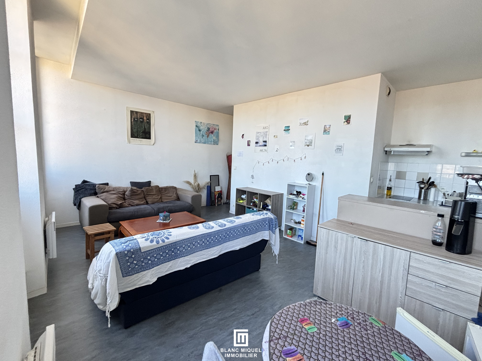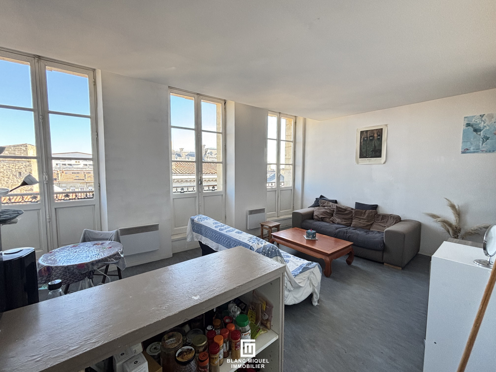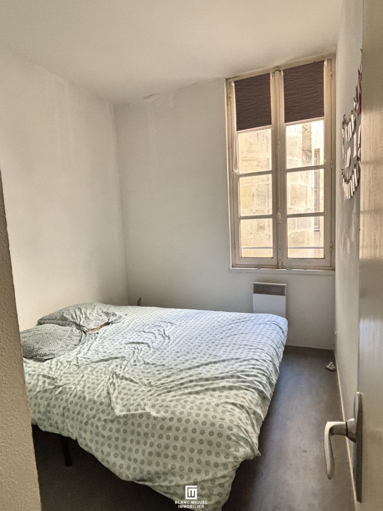 Bordeaux, au 4ème étage sans ascenseur d'un immeuble pierre, T2 Bis situé Cours Pasteur, composé d'une grande entrée, une pièce de vie avec cuisine ouverte avec balcon donnant rue Sainte Catherine, d'une chambre, d'un coin nuit au calme, donnant sur l'intérieur de l'immeuble et d'une salle de bains avec WC séparé.